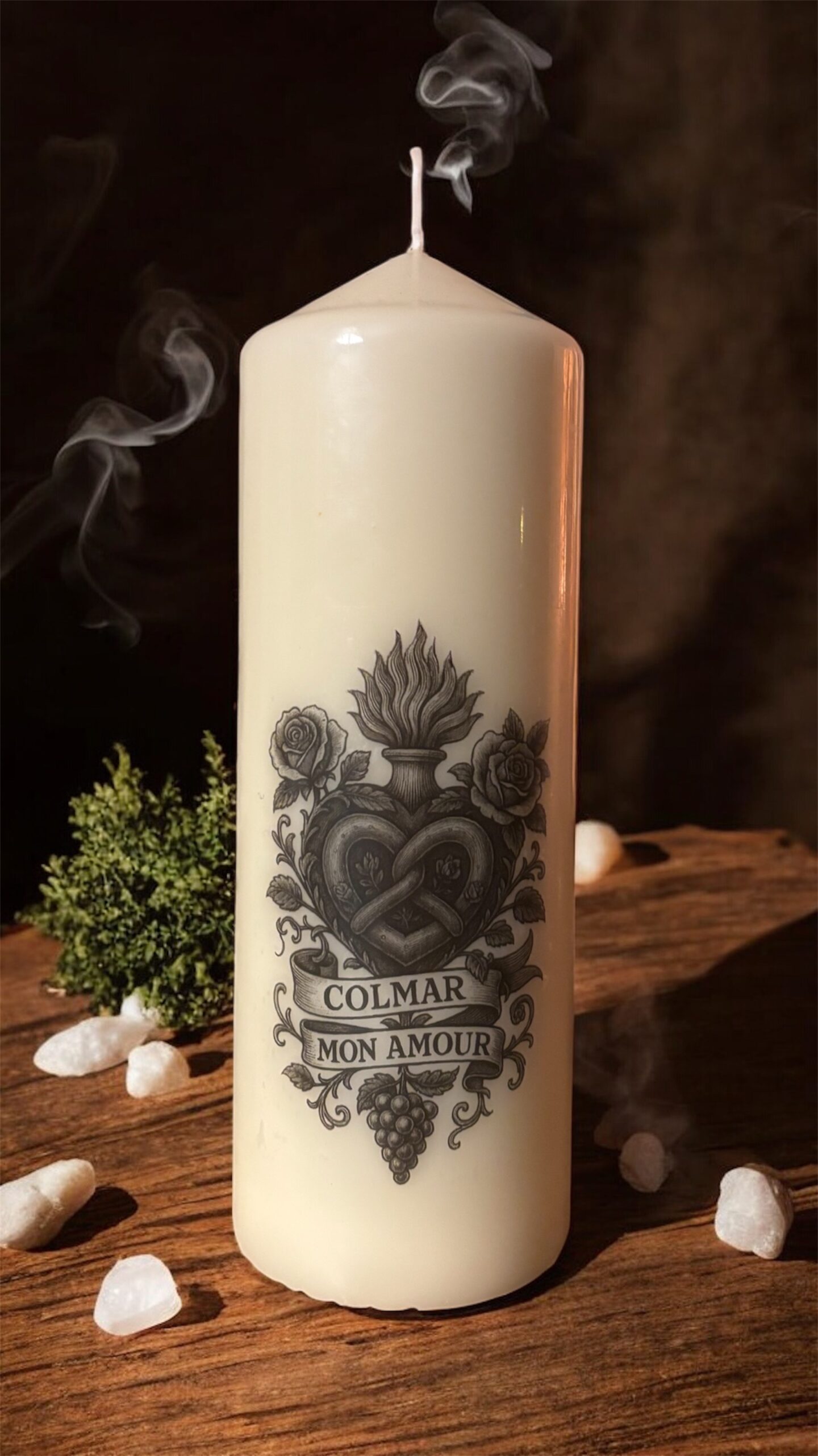 Bougie décorative, fabriquée aux Pays-Bas et décorée artisanalement dans mon atelier, à Colmar.