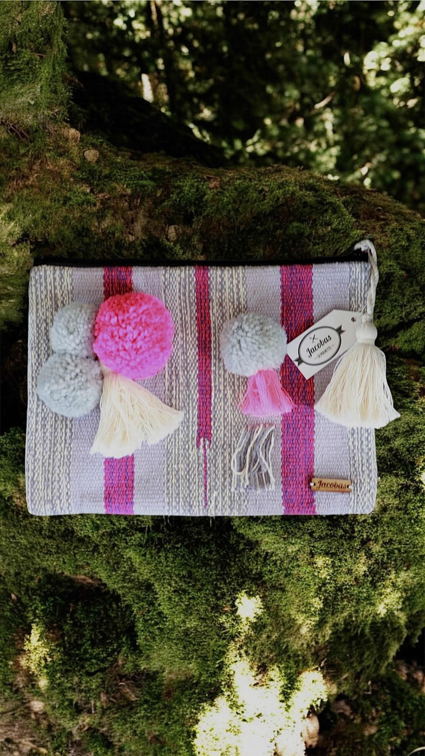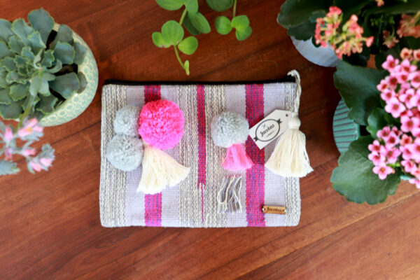 En savoir plus : Pochette à pompoms roses façon kilim – Atelier Jacobas